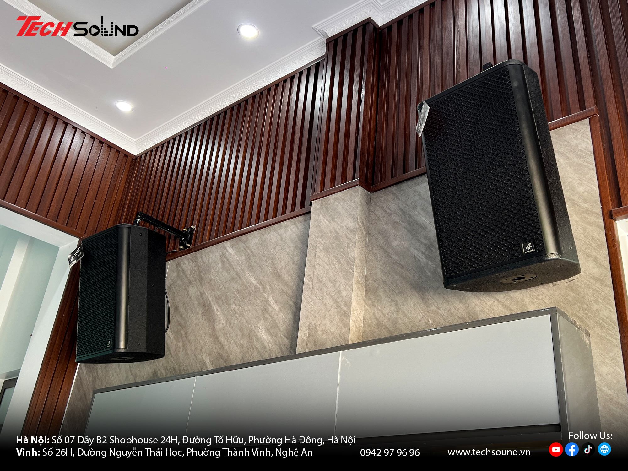 hờ vậy, dàn karaoke không chỉ đạt hiệu suất âm thanh mạnh mẽ, sống động mà còn hòa hợp hoàn hảo với không gian kinh doanh phòng hát. Thiết kế gọn gàng, chất lượng ổn định cùng khả năng tạo bầu không khí sôi động đã mang lại giá trị giải trí thực thụ, giúp không gian trở nên gần gũi, khác biệt và chuyên nghiệp hơn trong mắt mọi người. Với nhiều năm kinh nghiệm trong lĩnh vực âm thanh, TECHSOUND tự hào là địa chỉ chuyên cung cấp và lắp đặt dàn karaoke chính hãng cho hàng nghìn khách hàng trên toàn quốc. Chúng tôi không chỉ mang đến sản phẩm chất lượng từ những thương hiệu hàng đầu như 4Acoustic, Nexo, LEA Professional, NST Audio … mà còn hỗ trợ khảo sát, thiết kế cấu hình phù hợp với từng không gian thực tế. Cam kết lắp đặt chuyên nghiệp, bảo hành nhanh chóng, tư vấn tận tâm từ đội ngũ kỹ thuật giàu kinh nghiệm.