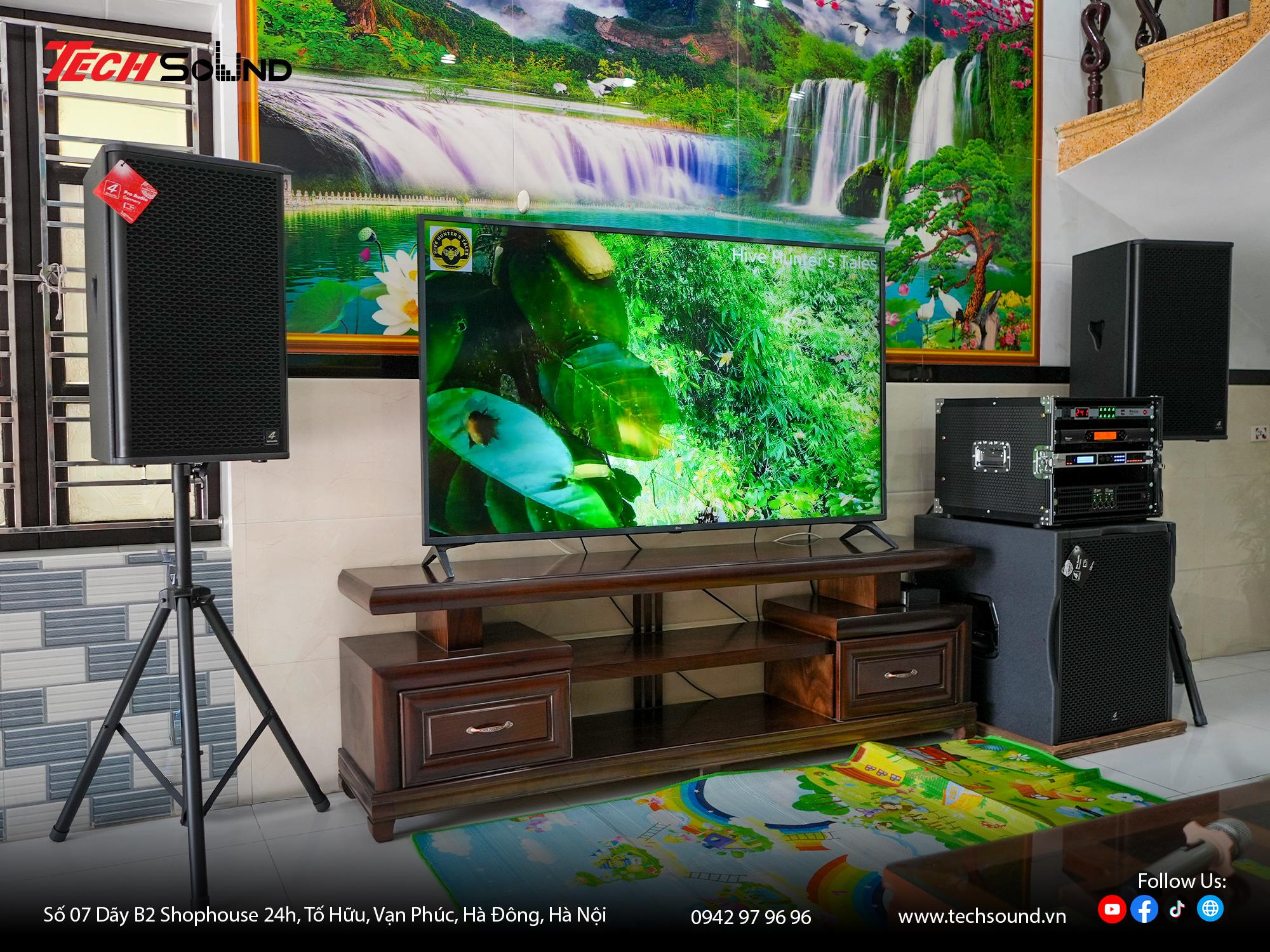Tại Thái Bình, TechSound đã trực tiếp triển khai và hoàn thiện hệ thống karaoke 4Acoustic chính hãng, phối ghép giữa loa Fullrange 4Acoustic PCS-X15 và Sub đồng bộ 4Acoustic 118BS. Tổng thể mang phong cách hiện đại, chỉn chu trong từng chi tiết, cho chất âm mạnh mẽ nhưng vẫn giữ được độ trong trẻo, dải trầm xuống sâu, gọn và chắc, giúp giọng hát lên rõ, sáng và giàu cảm xúc.
