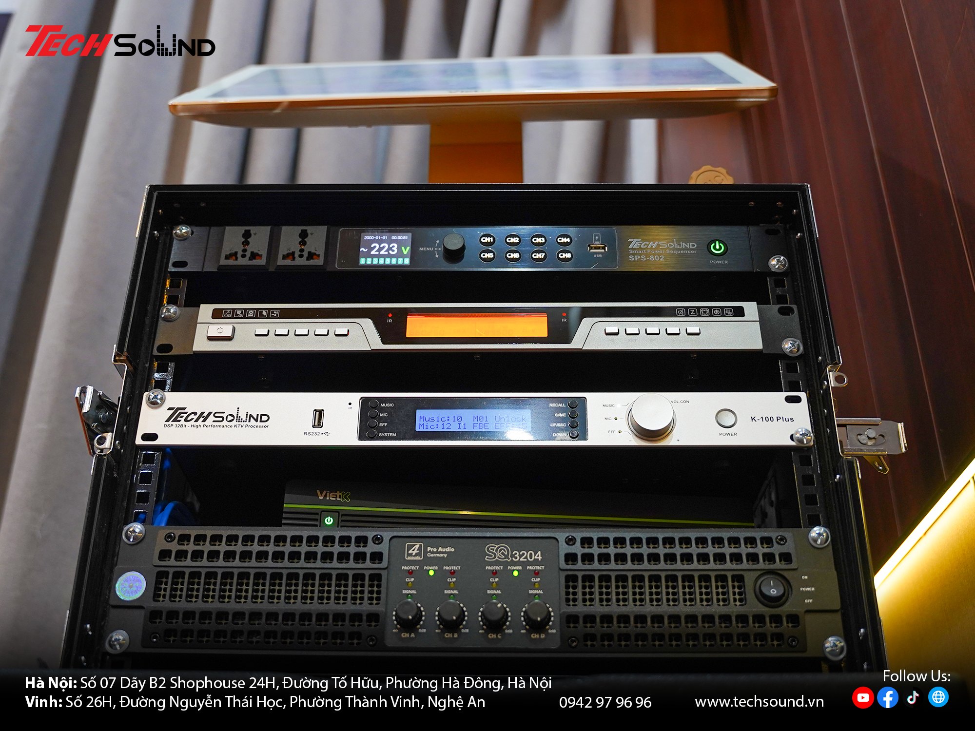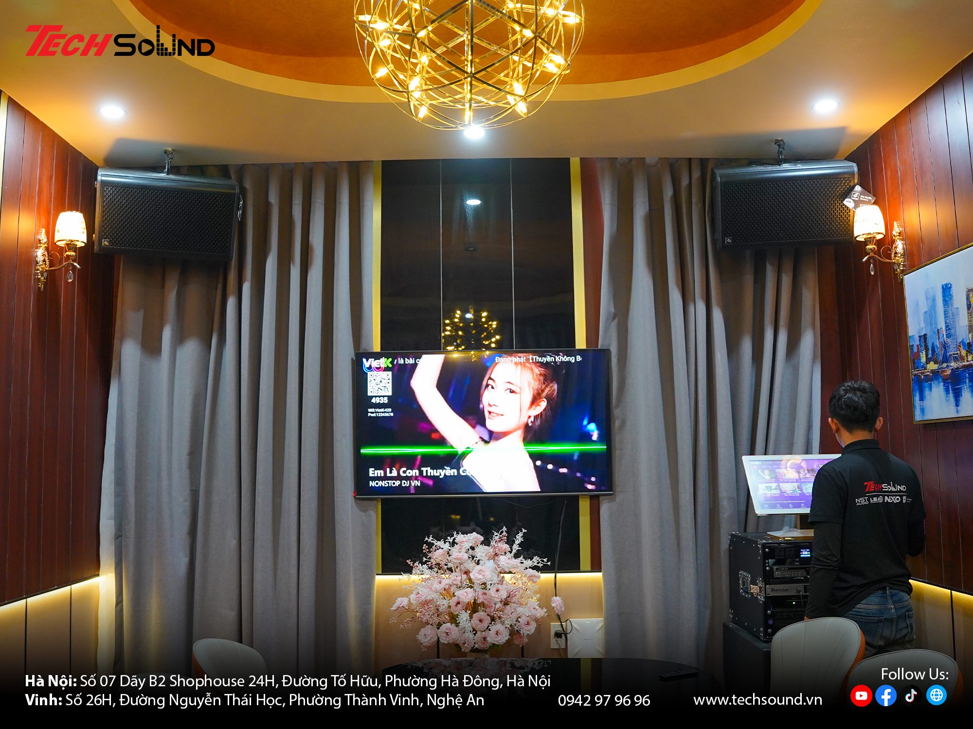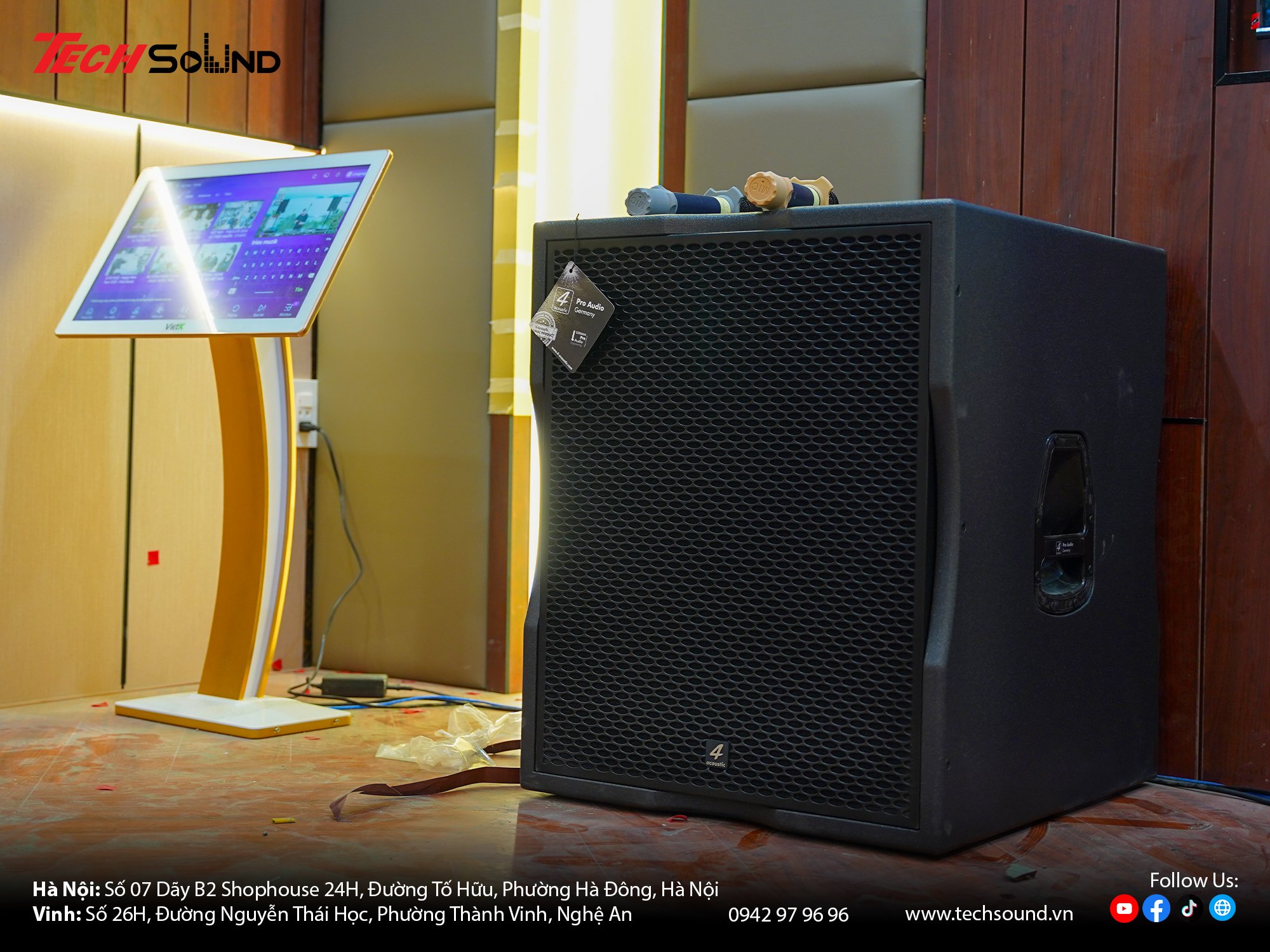 Với nhiều năm kinh nghiệm trong lĩnh vực âm thanh, TECHSOUND tự hào là địa chỉ chuyên cung cấp và lắp đặt dàn karaoke chính hãng cho hàng nghìn khách hàng trên toàn quốc. Chúng tôi không chỉ mang đến sản phẩm chất lượng từ những thương hiệu hàng đầu như 4Acoustic, Nexo, LEA Professional, NSP Audio Professional… mà còn hỗ trợ khảo sát, thiết kế cấu hình phù hợp với từng không gian thực tế. Cam kết lắp đặt chuyên nghiệp, bảo hành nhanh chóng, tư vấn tận tâm từ đội ngũ kỹ thuật giàu kinh nghiệm.
