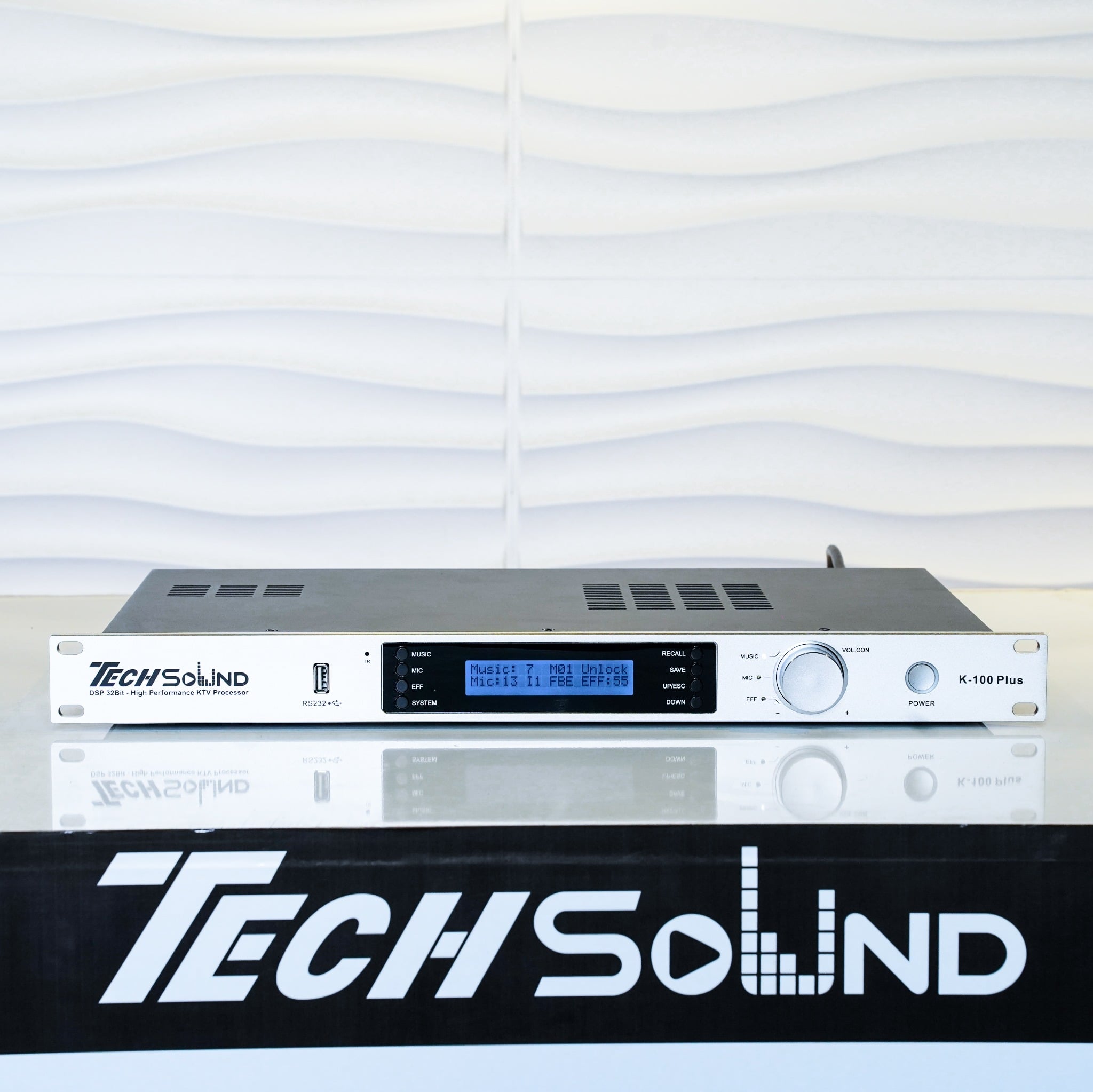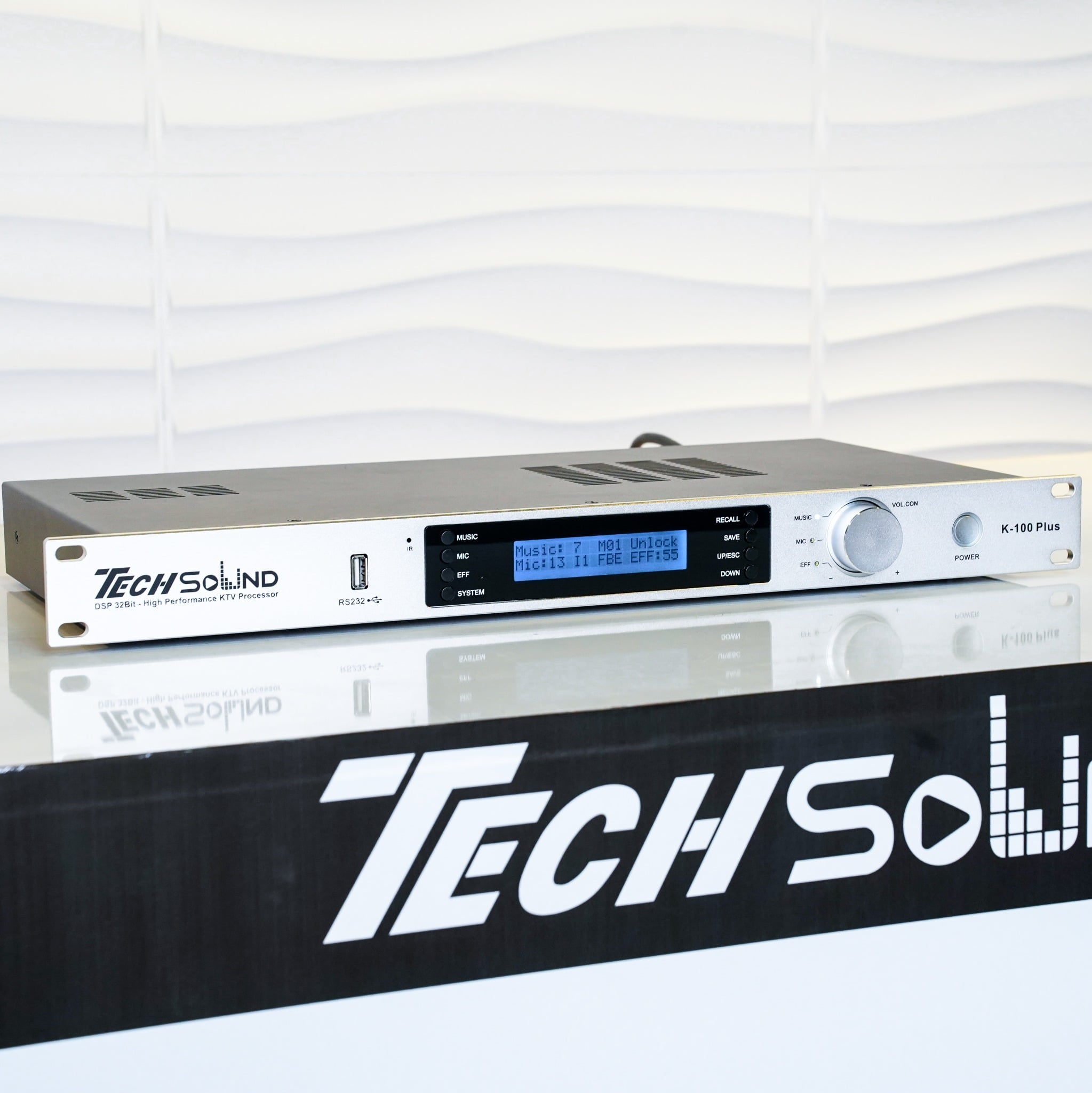 Vang số Techsound K-100 Plus có hiệu ứng karaoke kỹ thuật số với chức năng xử lý âm thanh đầu vào chuyên nghiệp. Sản phẩm tích hợp bộ xử lý kỹ thuật số âm thanh chuyên nghiệp sáu kênh và hiệu ứng kỹ thuật số DSP 32 Bits và tần số lấy mẫu 96Khz. Mỗi mô-đun chức năng có thể được gỡ lỗi độc lập và giao diện điều khiển gỡ lỗi PC tương ứng. Thiết bị đơn giản và trực quan, dễ vận hành và có hiệu suất chi phí cao hơn.